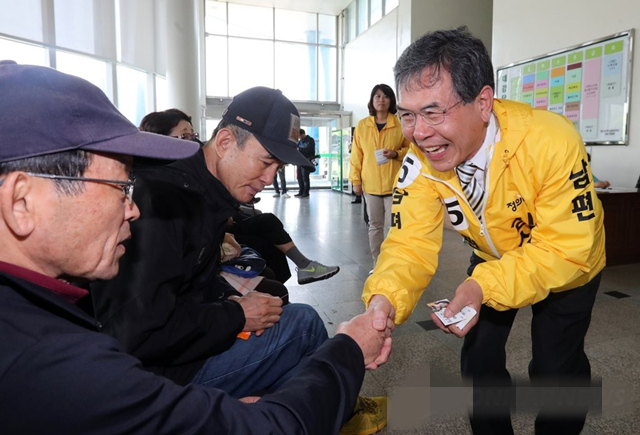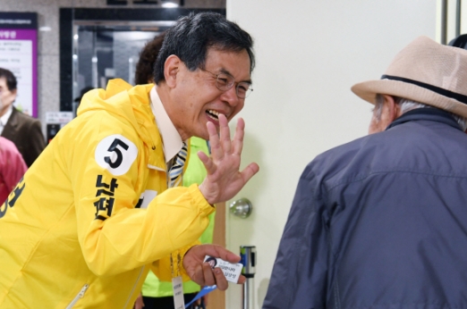 正義黨候選人沈相奵的丈夫李升培(音)25日上午前往京畿道高陽市日山老人綜合福利館,為夫人的競選造勢。