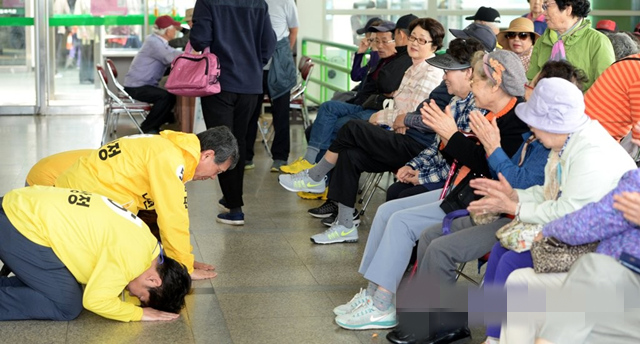 正義黨候選人沈相奵的丈夫李升培(音)25日上午前往京畿道高陽市日山老人綜合福利館,并向老人行跪拜禮,為夫人拉票。