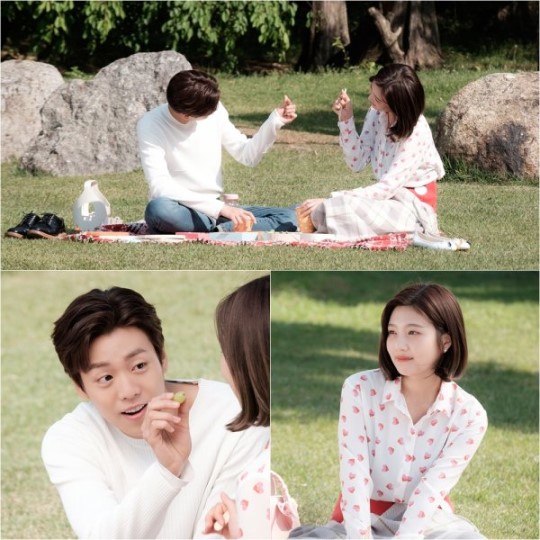 劇照中,李玹雨和Joy飾演的男女主角來到了戶外野餐。在灑滿陽光的草地上,兩人不僅比心示愛,李玹雨還親手喂Joy吃東西,彼此的眼神中都透露出濃濃愛意。李玹雨的白色針織衫與Joy的白底愛心襯衫充滿甜蜜的青春氣息,不愧是“清涼情侶”。