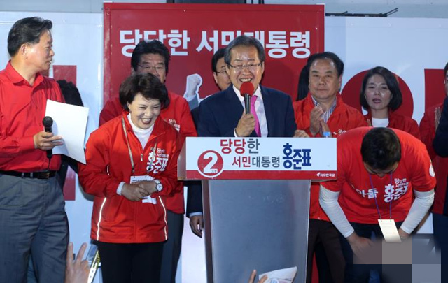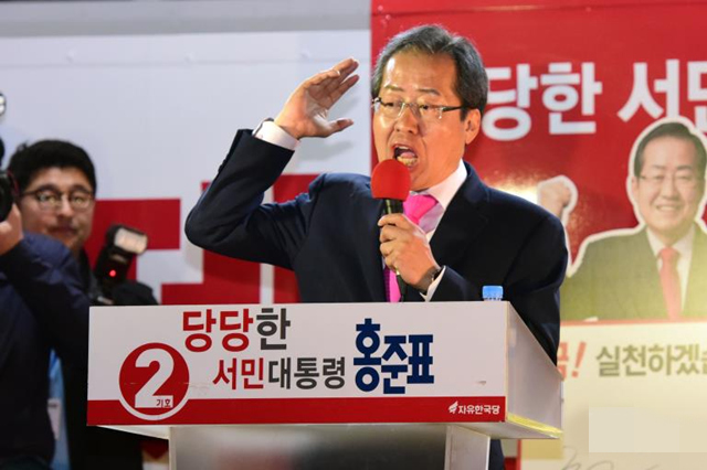 目前支持率呈上升之勢的自由韓國黨候選人洪準杓8日把主要精力放在“大本營”地區,當天上午他在釜山召開記者會,呼吁選民阻止左派陣營執政。隨后他奔赴大邱、大田和天安舉行大規模拉票活動。