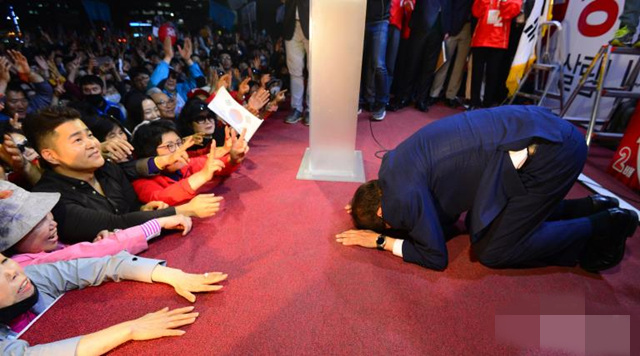 洪準杓跪拜民眾,呼吁支持者為自己投票。