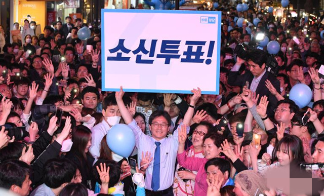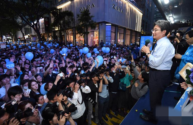 8日下午,劉承旼在首爾明洞街頭進行最后的競選造勢,號召支持者為自己投票。