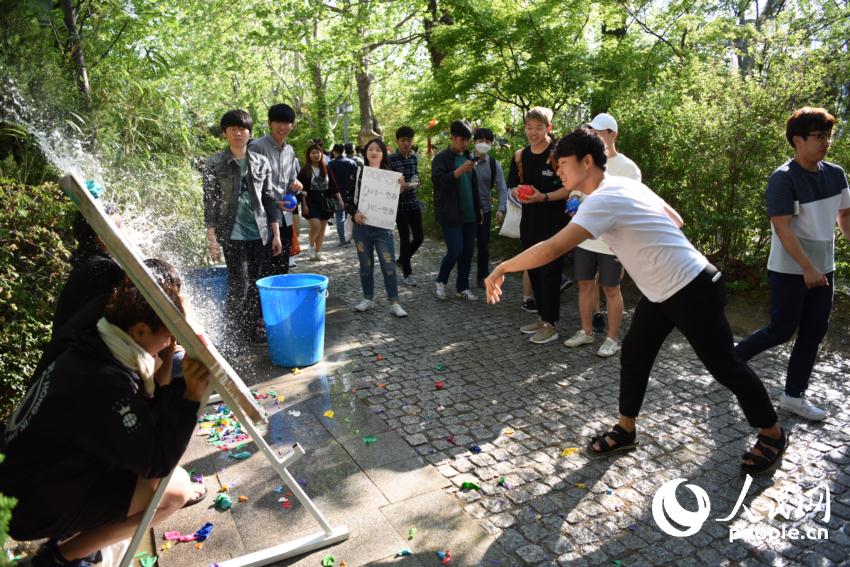 5月的天氣已經漸漸炎熱起來,扔水氣球無疑是男生們最喜愛的游戲項目。三名同學手持木板蹲在地上,將臉露出來當做靶標。只見一名男生將裝滿水的氣球用力扔向木板,“噗”的一聲,頓時水花四濺,讓人覺得涼爽無比。