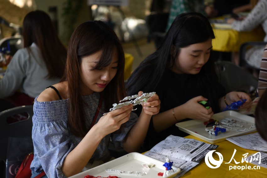 作為一所以藝術設計見長的學校,DIY活動在校慶中也是必不可少的。這不,在操場的另一頭,一群女生正在認真地制作手工玩具。