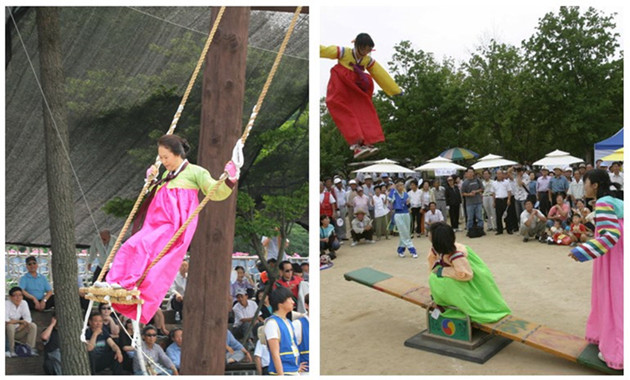 最受廣大韓國女性歡迎的端午傳統游戲是蕩秋千。蕩秋千時,韓服的彩色裙擺隨風飄蕩,猶如美麗的蝴蝶在飛舞。此外,蹺蹺板也深受韓國女性的喜愛。