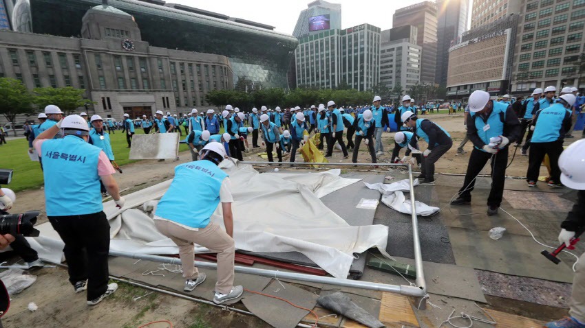 自保守派公民團體1月21日非法占用首爾廣場以來,首爾市政府先后22次向他們下達了要求自行拆除的通告,均遭到拒絕。因此,政府不得不根據相關管理條例實行強拆。