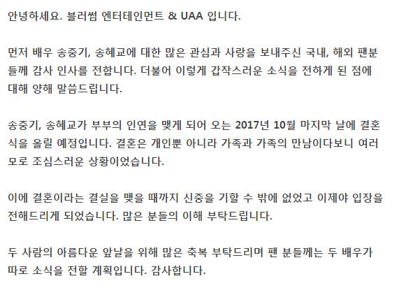 宋仲基所屬經紀公司Blossom娛樂與宋慧喬所屬經紀公司UAA官方發表聯合聲明,內容如下: