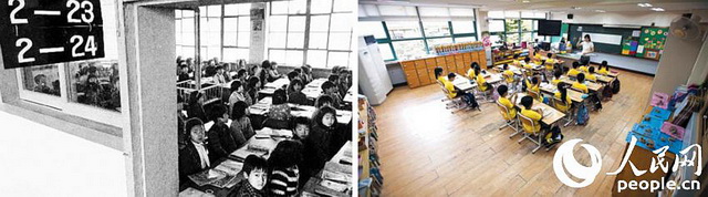上圖為首爾市某小學在1979年(左)和2017年(右)班級人數的對比。左圖中60多名學生擠在一個教室里聽課;而如右圖所示,如今的一個班只有20多名學生。教室雖寬敞明亮,卻顯得有些空蕩蕩。