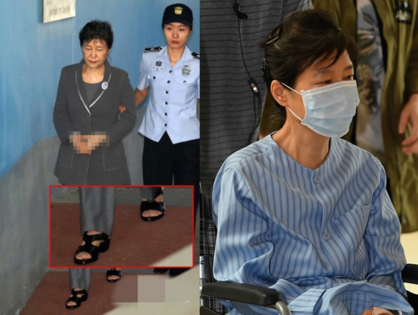左圖為樸槿惠左腳腳趾受傷,7月14日穿黑色涼鞋出庭。右圖為樸槿惠因腰部疼痛,于8月30日前往醫院就診。