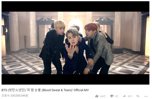 據韓國經紀公司BigHit娛樂30日消息,截至29日下午5時47分許,旗下男團防彈少年團(BTS)第二張正規專輯《WINGS》主打曲《血汗淚》在視頻網站YouTube上播放量突破2億次。