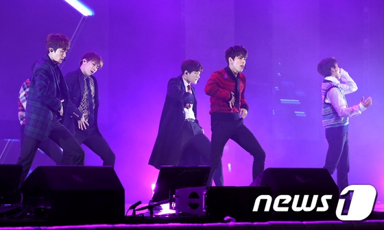 當日,金圣圭、張東雨、南優鉉、李浩沅、李成烈、金明洙、李成鐘等7名INFINITE成員在舞臺上勁歌熱舞,嗨翻全場。他們的穿搭盡顯英倫紳士風。