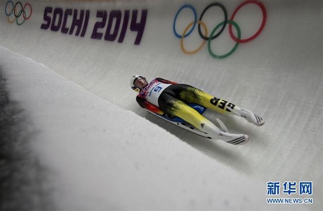 圖為2014年2月11日,德國選手許夫納在2014年索契冬奧會無舵雪橇女子單人項目比賽中。 新華社記者費茂華攝