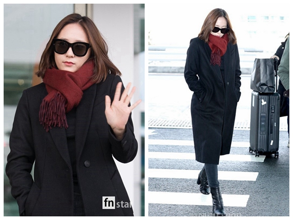 鄭秀晶的這身穿搭與上面樸海鎮的有異曲同工之妙,她使用了紅色圍巾的單品,帶來了新年氛圍的同時不失時尚度UP。