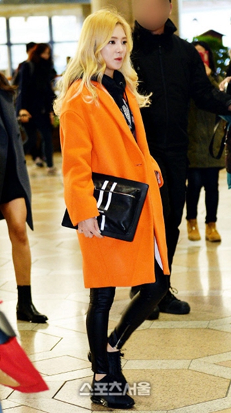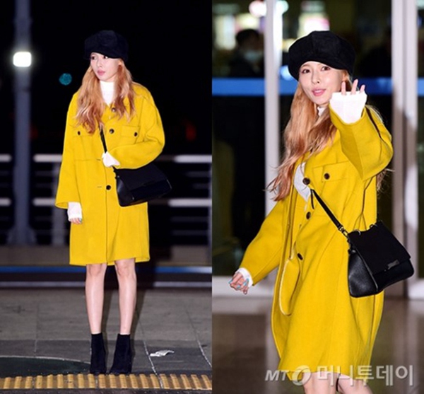 “小野馬”泫雅的咖喱黃色大衣也不錯,但是下面一定要穿黑褲或黑色長筒襪,絕對是吸睛殺手。