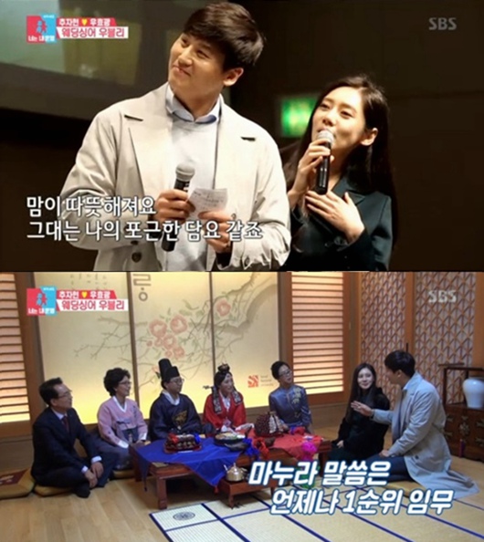 在婚禮當天,秋于夫婦演唱了屬于他們二人的歌曲《就是你》。此外,他們還送出了心意滿滿的禮物——于曉光親筆書寫的“!弊趾颓锎伸艦樾禄榉驄D畫的畫像。于曉光向中國姑爺傳授經驗:“老婆的話永遠放在第一位,讓你往東走你就不能往西走,老婆的話無論對錯都是對的,我們的義務就是讓老婆幸福!彼又袊@道:“結婚真好!”現場頓時爆發出笑聲。