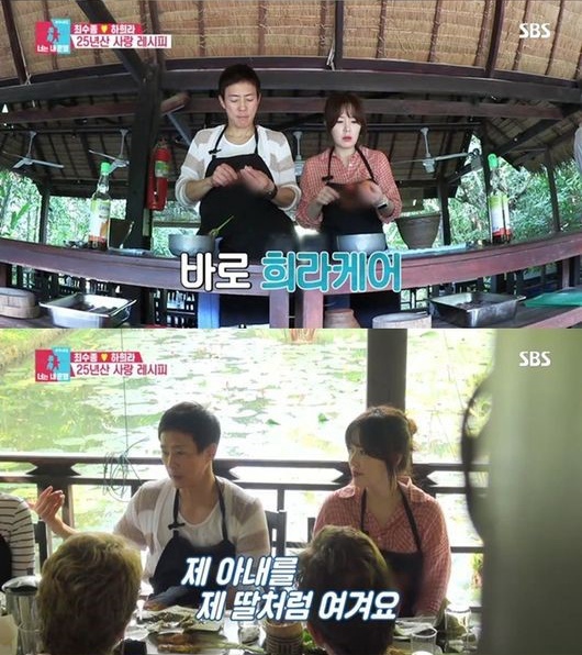崔鐘秀、河熙羅夫婦經過7個小時的顛簸終于來到了老撾瑯勃拉邦。他們一起體驗了當地的料理制作課程,還在課上結識了一對結婚40年的夫妻。這對老夫老妻表達了他們的感想:“一開始的25年很漫長,可是后面的15年簡直過得飛快!痹谝黄鸱窒硎澄锏倪^程中,他們還分享了夫婦之間不吵架的秘訣,那就是把妻子當做女兒一樣寵。河熙羅、崔秀鐘夫婦表示強烈認同。