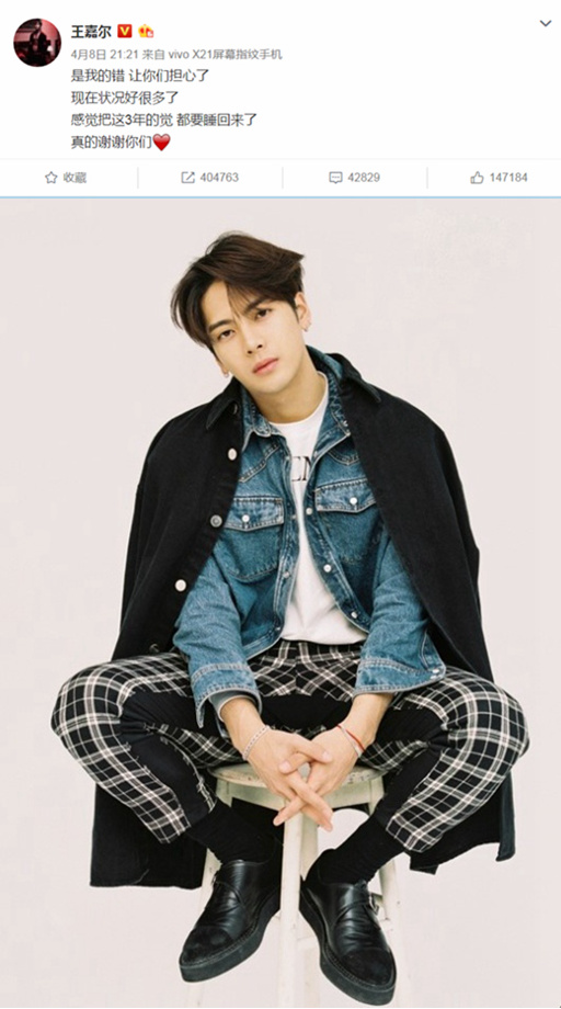 人民網訊 近日,韓國男團GOT7成員王嘉爾因身體原因,暫時取消全部行程。粉絲得知此消息后,紛紛表示擔憂。8日,為讓粉絲放心,王嘉爾在社交媒體上發布一段文字,“是我的錯,讓你們擔心了,現在狀況好很多了,感覺把這3年的覺都要睡回來了,真的謝謝你們”。