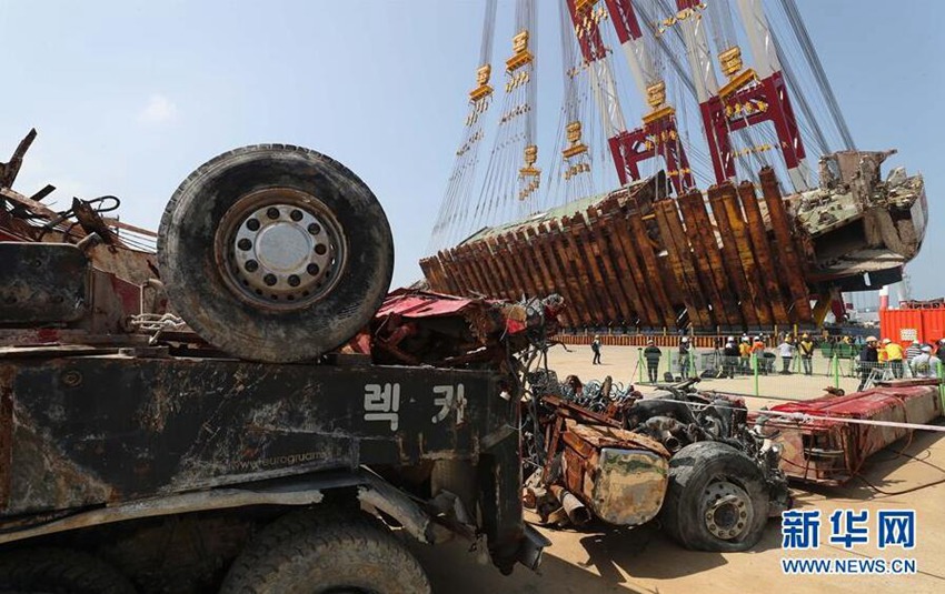 這是5月10日在韓國全羅南道木浦新港碼頭拍攝的“世越”號沉船船體扶正作業現場。新華社/紐西斯通訊社