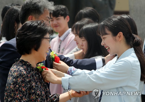15日教師節當天,韓國論山市強競高中(音)學生為老師戴上康乃馨,表達感恩之情。