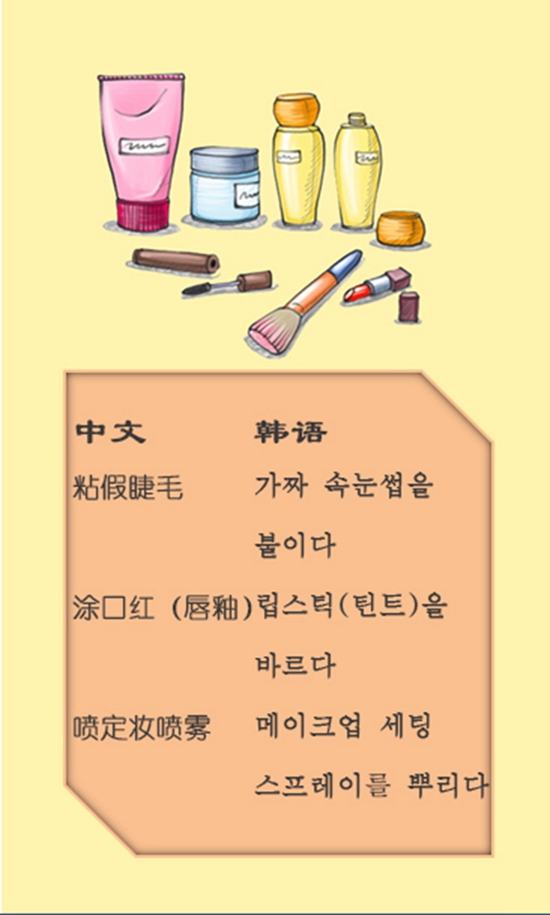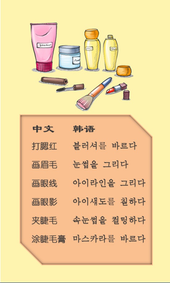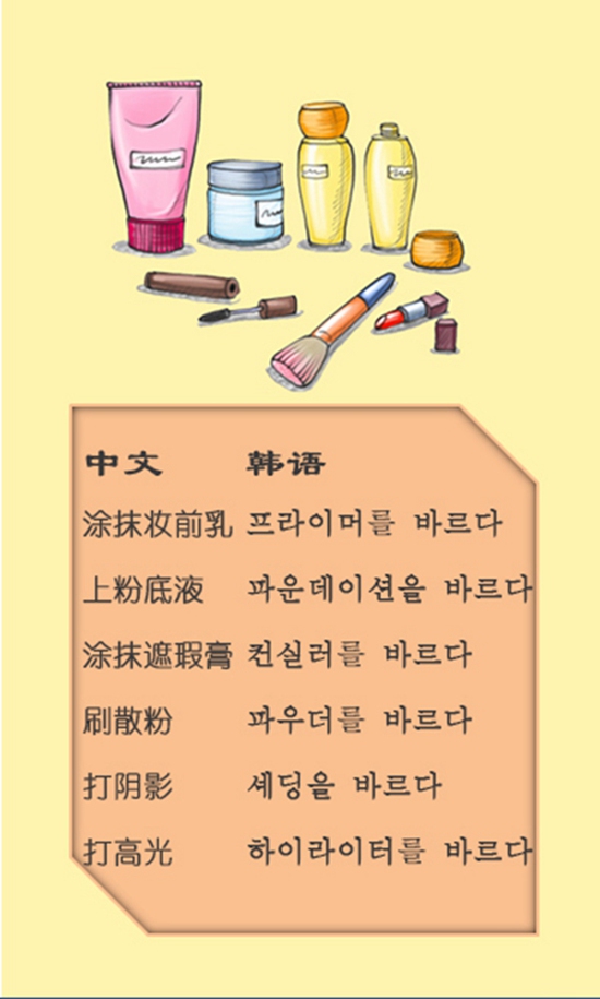 小編送上福利——《美妝達人的單詞本》,通過這檔新欄目能學習與美妝有關的各類韓語單詞,包括肌膚問題、護膚產品以及美妝產品用語。機智的小編將推出系列稿件,繼護膚篇、底妝篇、眼妝篇和唇妝篇之后,第五篇“化妝步驟篇”歸納了關于各種化妝步驟的中韓對照名稱,并將各種化妝步驟依順序排列,大家一起學起來吧。