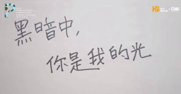 樸有天親手寫中文感謝粉絲 “黑暗中,你是我的光”