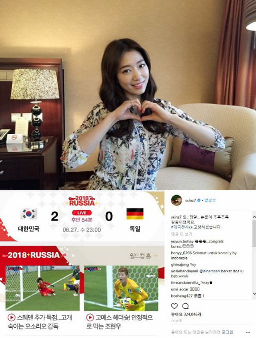 與此同時,韓國娛樂圈藝人們紛紛發表賀電!傲钊烁屑ぬ榱惆,太極戰士們,辛苦了!睒阈呕莸谝粫r間內在社交媒體上祝賀韓國隊喜訊。