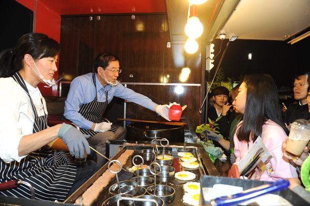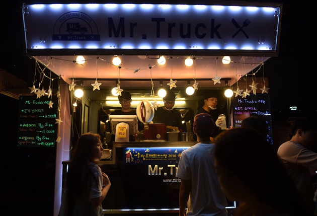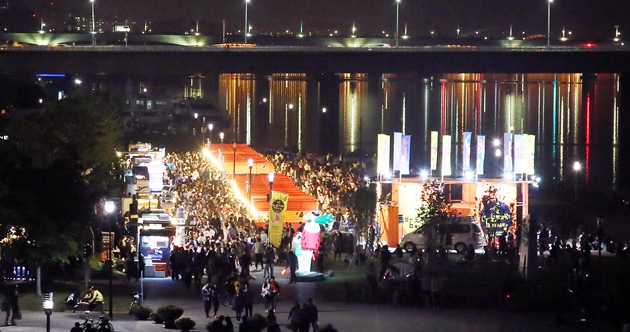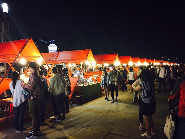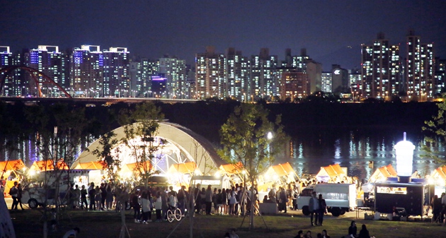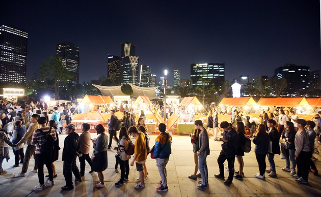 如果有幸來到今年率先推出夜市的汝矣島漢江公園水光廣場,就算是開啟了尋找美食的世界旅行。汝矣島夜市的主題是“一夜的世界旅行”,主題的概念是在特定的時間,特定的空間轉變為全新空間和場地。入駐商戶包括普通類商戶70家,食品類商戶30家,這些商戶是由專家、職場人、大學生、普通市民等300人組成的評委會通過“現場鑒定會”方式評選出來的。在購物角,可以看到來自世界各國的手工藝品,而在熱鬧的表演角,可以欣賞到世界傳統表演、現代表演、街頭演出、Guerilla表演等各類節目。