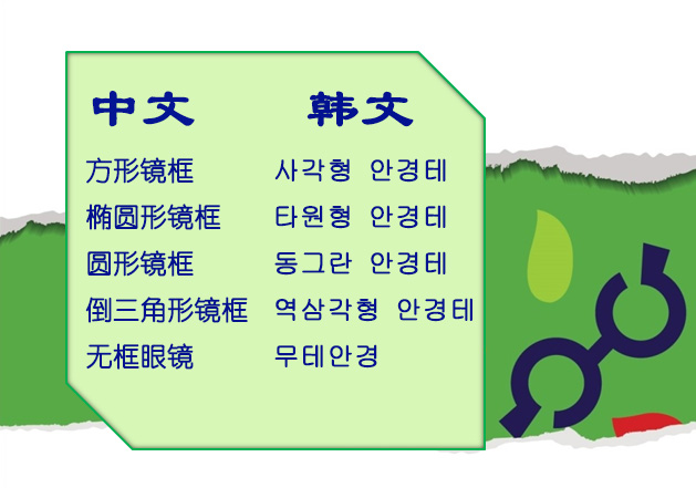 如何找到一款適合自己臉型的鏡框呢?如果是圓臉,適合挑選鏡框較粗而鏡片呈扁長方形;如果是長臉,這樣的臉型就是避免與臉型相似的鏡片,倒三角形鏡框就與你速配;如果是方臉,適合戴橢圓形的。最后,蛋形臉的人最幸福,可以多種嘗試,長方形、圓形、橢圓、倒三角等都很合適。各種臉型和鏡框形狀用韓語怎么說呢?一起來看看吧。