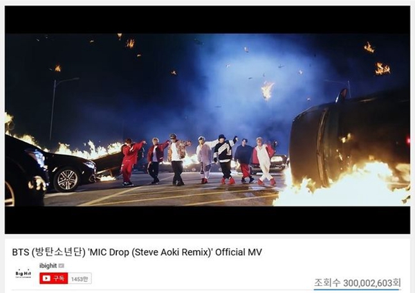 據韓媒報道,截止到26日下午6時52分(當地時間),于去年11月公開的防彈少年團《MIC Drop》MV的播放量已超過3億次。這是防彈少年團繼《DNA》《火燃燒起來了》《DOPE》《血、汗、淚》之后,第5支MV播放量超過了3億次,創下韓國愛豆組合的最多紀錄。