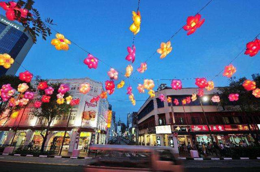 新加坡牛車水的街道旁亮起中秋節花燈。