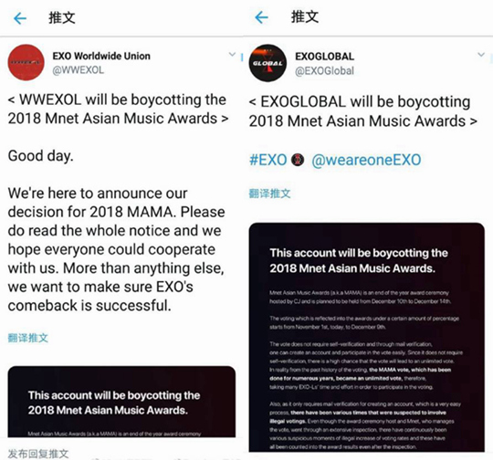 超人氣男團EXO今年并未參與MAMA投票,且MAMA11月1日開啟投票的時間,正好撞上了11月2日EXO的回歸日,引起許多EXO粉絲不滿。昨日,EXO最大粉絲應援站EXO Worldwide Union發表倡議書,建議EXO粉絲聯合抵制MAMA,專注EXO回歸活動。