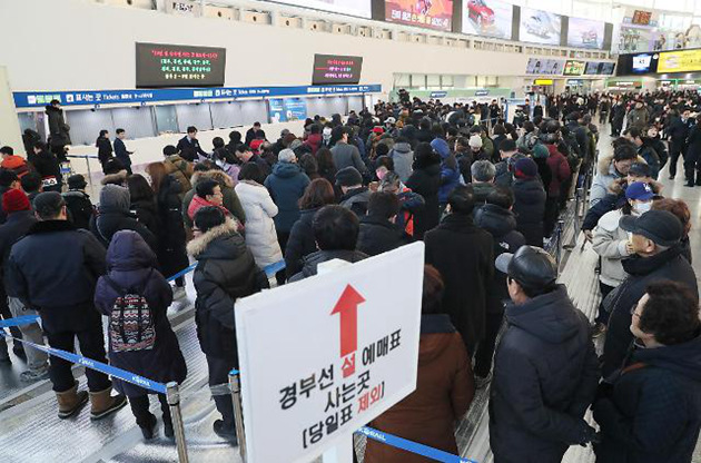 1月8日上午,首爾站車票預售窗口,市民排起長隊等待購買春節返鄉車票!緢D片提供 韓聯社】