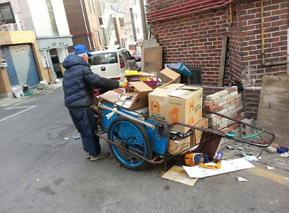 首爾街頭一位老人在回收廢紙箱!緢D片來源 網絡】
