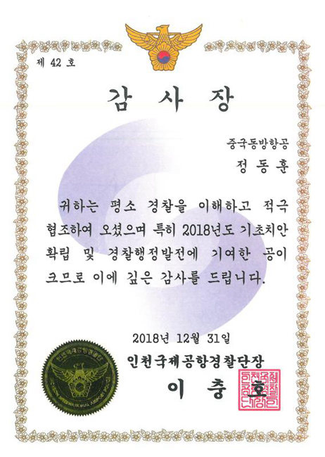 人民網仁川3月25日電(夏雪) 近期,仁川國際機場警察局向東航仁川機場韓籍管理人員次長鄭東勛頒發“感謝狀”,感謝東航2018年對仁川空港警察局工作的支持和配合。