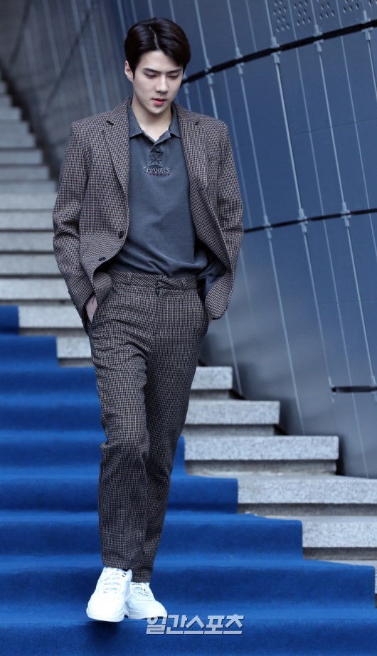 1/10人民網訊 24日下午,韓國人氣男團EXO成員吳世勛、SHINee成員泰民出席了在東大門設計廣場(DDP)舉行的首爾時裝周。當日,泰民在黑色星星圖案西裝的加持下顯得耀眼吸睛,世勛則走起低調路線,身著褐色格紋西裝依舊帥氣迷人。(圖為EXO吳世勛)