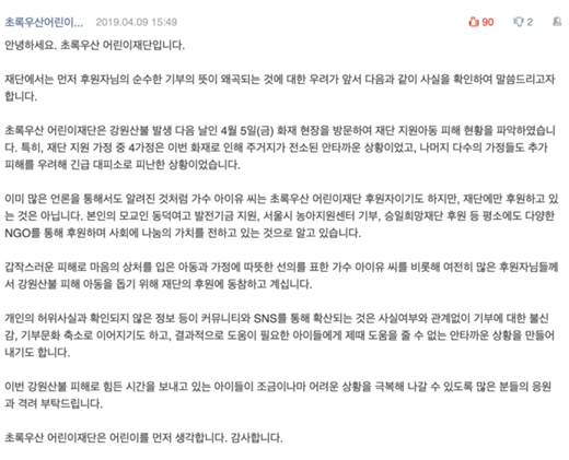 9日,綠傘兒童基金會出面發表了正式立場!坝捎趽木杩钊思兇獾囊鈭D被曲解,本基金會決定澄清本次事實。我們在4月5日訪問受訪地區之后確認了基金會資助兒童的受災情況。其中基金會長期贊助的兒童們和家人的房子已被山火燒毀,其余的受害者們則疏散到緊急中心。作為綠傘兒童基金會的贊助者,IU不僅捐款給組織,也有固定資助母校東德女子高中、首爾聾啞人支援中心、勝日希望基金會等”。