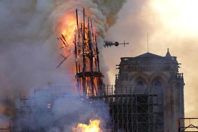 當地時間15日晚,巴黎著名地標巴黎圣母院發生火災,穹頂受損,標志性尖塔倒塌。