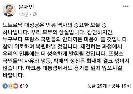據韓聯社報道,韓國總統文在寅16日在臉書發文對巴黎圣母院發生火災表達關切。他寫道,巴黎圣母院是人類歷史的無價之寶之一,圣母院被燒毀是全人類的一大損失。