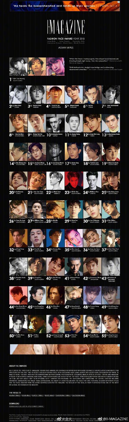 1/16人民網訊 “I-MAGAZINE FASHION FACE AWARDS YEAR 2018”亞洲榜單結果今日公布,人氣天團防彈少年團成員金泰亨位列榜首。在公開的榜單中,HIGHLIGHT尹斗俊躋身第四名,ASTRO車銀優排名第八,EXO張藝興排第十一名。此外,INFINITE金明洙(第14名)、GOT7王嘉爾(第15名)、李棟旭(第16名)、樸寶劍(第18名)、南柱赫(第19名)、NCT李泰容(第21名)、GOT7段宜恩(第22名)、EXO吳世勛(第23名)、徐康。ǖ25名)、梁世宗(第26名)、HIGHLIGHT李起光(第30名)等明星也一同上榜。