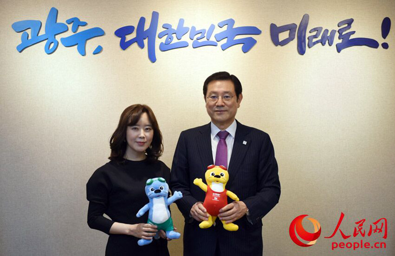 圖為光州市長李庸燮(右)與人民網記者周玉波的合影。