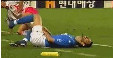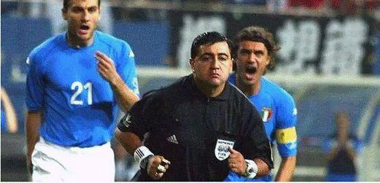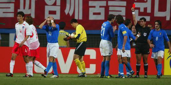 2002年日韓世界杯1/8決賽意大利VS韓國的比賽中,下半場時,意大利隊的贊布羅塔被韓國隊的黃善洪飛鏟放倒,主裁判罰犯規并未出示黃牌。