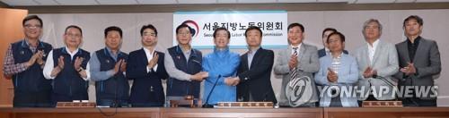 資料圖片:5月15日,首爾市公交工會和運輸事業合作社(資方)達成勞資協議后與首爾市長樸元淳(藍衣)合影。(韓聯社)