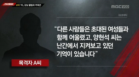 目擊證人稱“當時用的強奸用藥物又稱GHB,YG難脫干系”。然而梁鉉錫稱其毫無根據。此外,警方于27日召開的例行記者見面會上表示,現在沒有確定下來的內容,沒有相關證詞,將會根據報道內容進行深入調查。