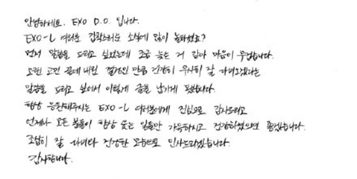 與此同時,都暻秀公開了一則手寫信向粉絲們表達了自己的心境。在信中,都暻秀寫道:“本來想先和大家講的,結果好像有點晚了,心情有點沉重。向一直支持我們的EXO-L表示真心的感謝。我會好好地去,并健康歸來給大家問好的,謝謝大家!