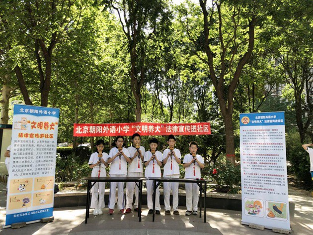 人民網訊 隨著人們生活水平日益提高,養寵物犬成為許多群眾的一項時尚選擇,但隨之也帶來不文明的養犬行為。為了提高社區居民文明養犬意識、關注社區環境衛生、積極引導市民依法、文明養犬,創造一個宜居文明的社區環境。5月31日,北京朝陽外語小學五年級三班的全體學生在班主任張秀麗老師的帶領下,分成三個小組,分別前往安貞社區、勝古莊社區和元大都公園,開展“文明養犬”法律宣傳進社區活動,活動得到了安貞社區和勝古莊社區居委會的大力支持!