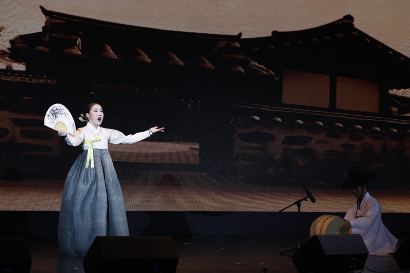 在當天活動現場,中韓兩國藝術家帶來了精彩演出。國家非物質文化遺產傳承人、著名粵劇表演藝術家歐凱明演繹了著名的“馬腔”,板索里非遺傳承人弟子金秀智演唱了傳承至今的“板索里五部”之一的曲目《沈清歌》,國際雜技比賽最高獎“金小丑”獎獲得者吳正丹、魏葆華夫婦帶來的肩上芭蕾再次將現場氣氛推向了高潮,全場掌聲如雷。