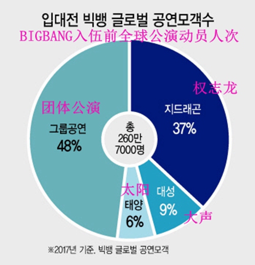 據報道,BIGBANG對YG利潤貢獻率最大,占70-80%左右,而入伍前權志龍個人的貢獻率是BIGBANG中最高的。資料顯示,2017年BIGBANG成員入伍前全球巡演動員約為260萬人次,其中組合公演動員占比48%,權志龍個人SOLO動員占比37%,約為96萬人次,大聲24萬人占比9%,其次為太陽15萬人占比7%。