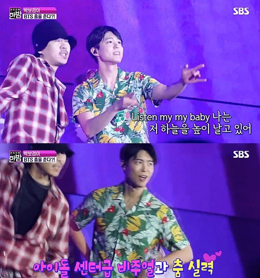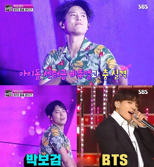 人民網訊 25日晚,SBS電視臺綜藝節目《深夜正式演藝》播出了韓國演員樸寶劍在菲律賓舉辦的演唱會現場畫面。演唱會上,樸寶劍模仿了大熱男團防彈少年團的舞蹈,不低的舞蹈實力引發網友稱贊。