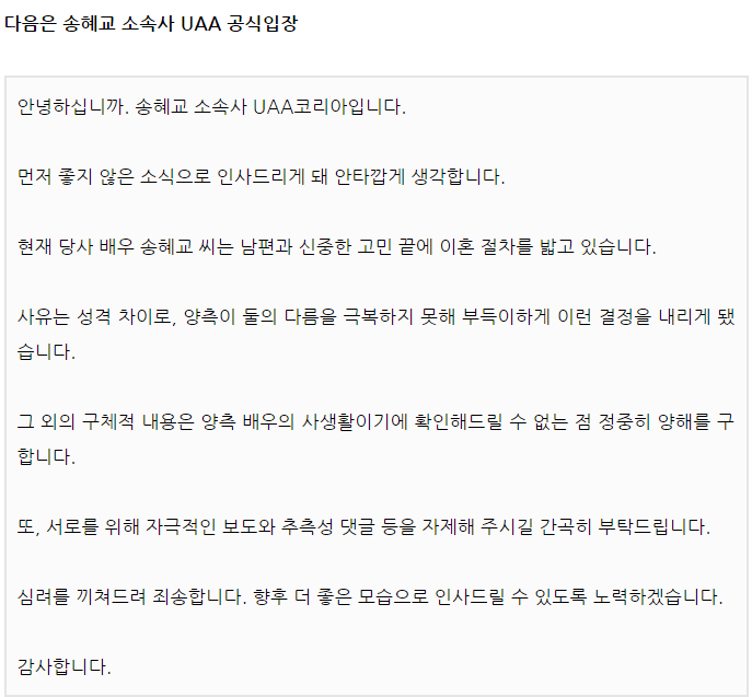 首先,向大家公布不好的消息讓我們感到十分抱歉。我公司演員宋慧喬與丈夫在經過深思熟慮后決定離婚。
