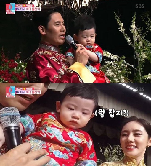 ● 7月1日,綜藝節目《同床異夢2-你是我的命運》播出了秋瓷炫、于曉光夫婦婚禮的細節,并首次公開了秋于夫婦兒子“啪嗒(大海)”的正臉!芭距比菝睬逍,集合了秋于夫婦二人的優點,眼睛像媽媽,還隱約有著爸爸的影子,十分可愛討喜。